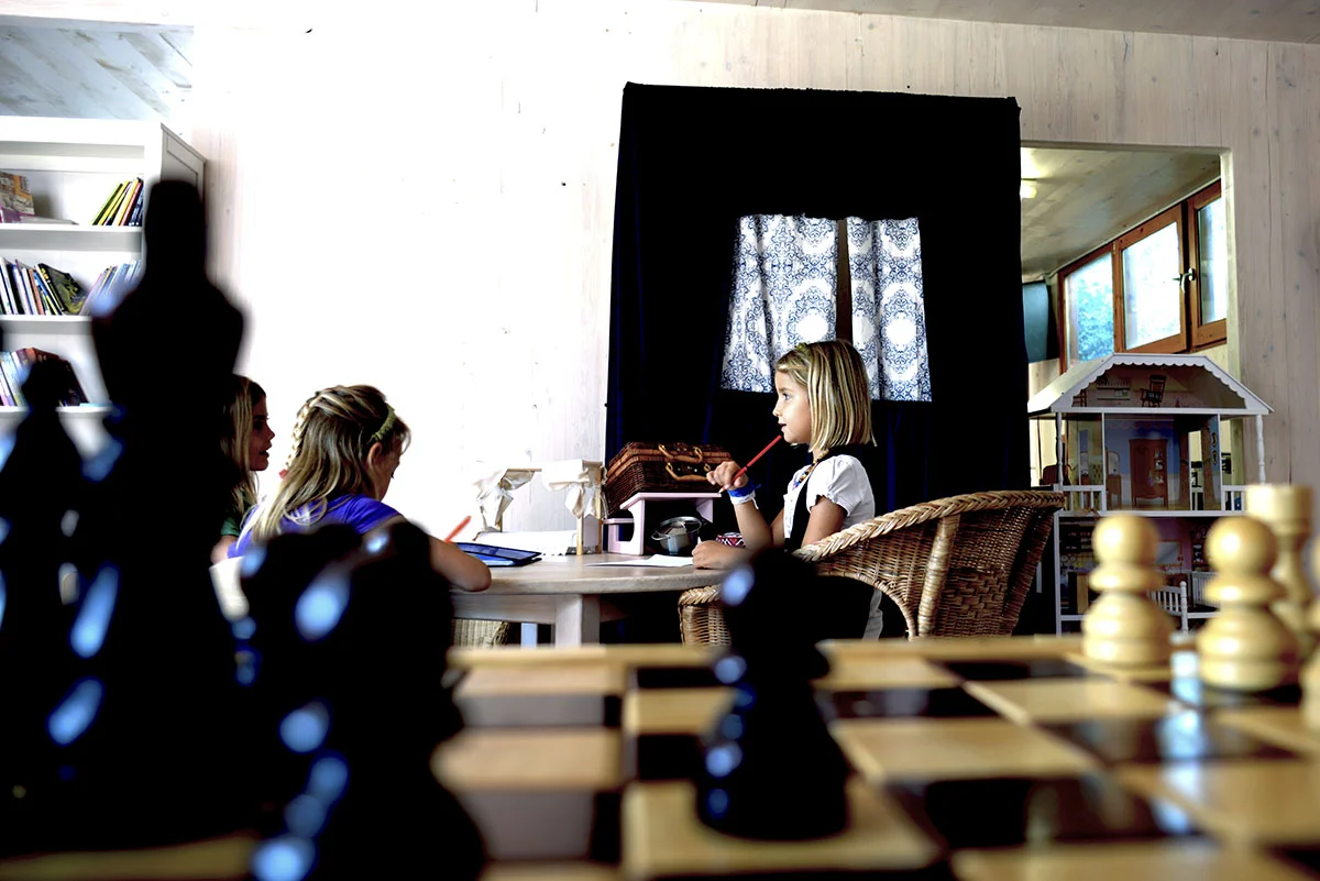 Mientras en el jardín Diego charla con Manel, el fundador y alma de la escuela, Jara y yo nos descalzamos y entramos en una sala de juego donde hay un gran sofá rojo. En la sala de al lado encuentro una estantería repleta de libros. Tres chicos juegan al ajedrez en un tablero gigante con piezas de madera. Suena música clásica. Y no parece una escuela, sino el elegante salón de una casa moderna. Al rato, una mamá se sienta a leerle cuentos a su hija. Y un grupo de niñas (y niño) ocupa el sofá para su sesión de punto, que algo después evolucionará en costura a máquina.