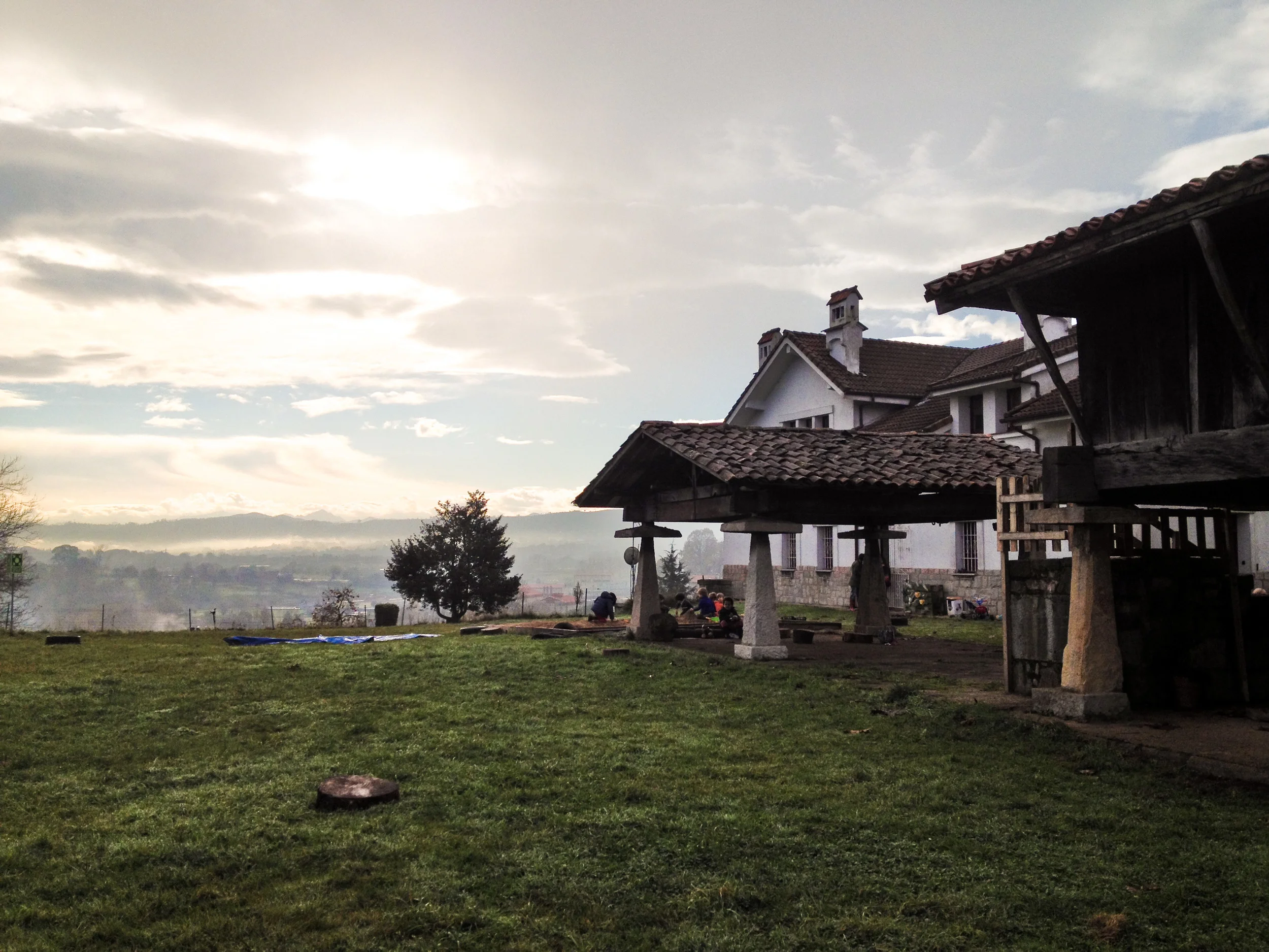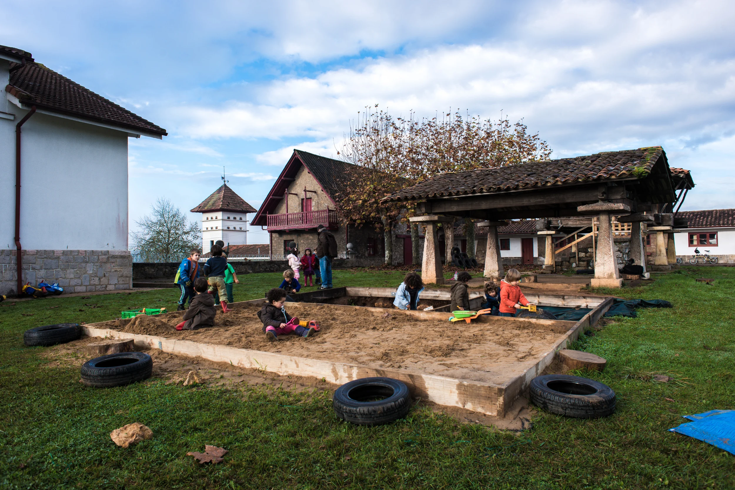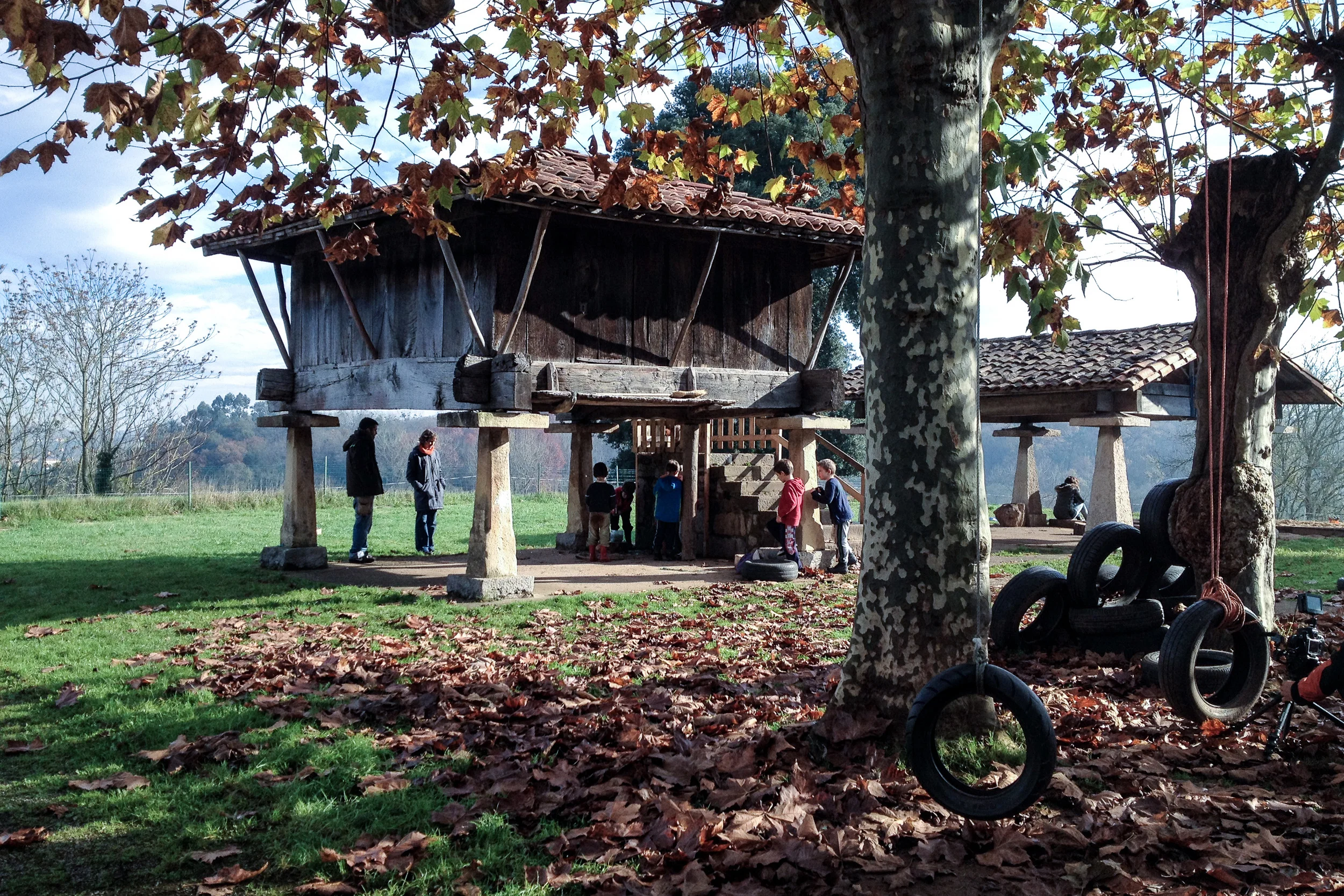 Así que cuando nada más llegar a la escuela se nos apareció delante, como una visión, el gran hórreo que ocupa el centro del jardín, simplemente sonreímos, porque ¿quién podría imaginar mejor espacio de juego que un viejo granero de madera, oscuro y misterioso, al que hay que subir trepando? Pero esta antigua granja renacida como colegio ofrece muchas más posibilidades... Bajo el hórreo, un chico se pone a prueba cortando un bloque de hielo con un hacha. Un poco más allá, en un arenero, varios niños se entretienen usando la mezcla de agua y arena para experimentar con las leyes de la física, y con el tacto de sus manos. Los montes cubiertos de un verde profundo parecen observarlo todo, como gigantes que custodian el horizonte.