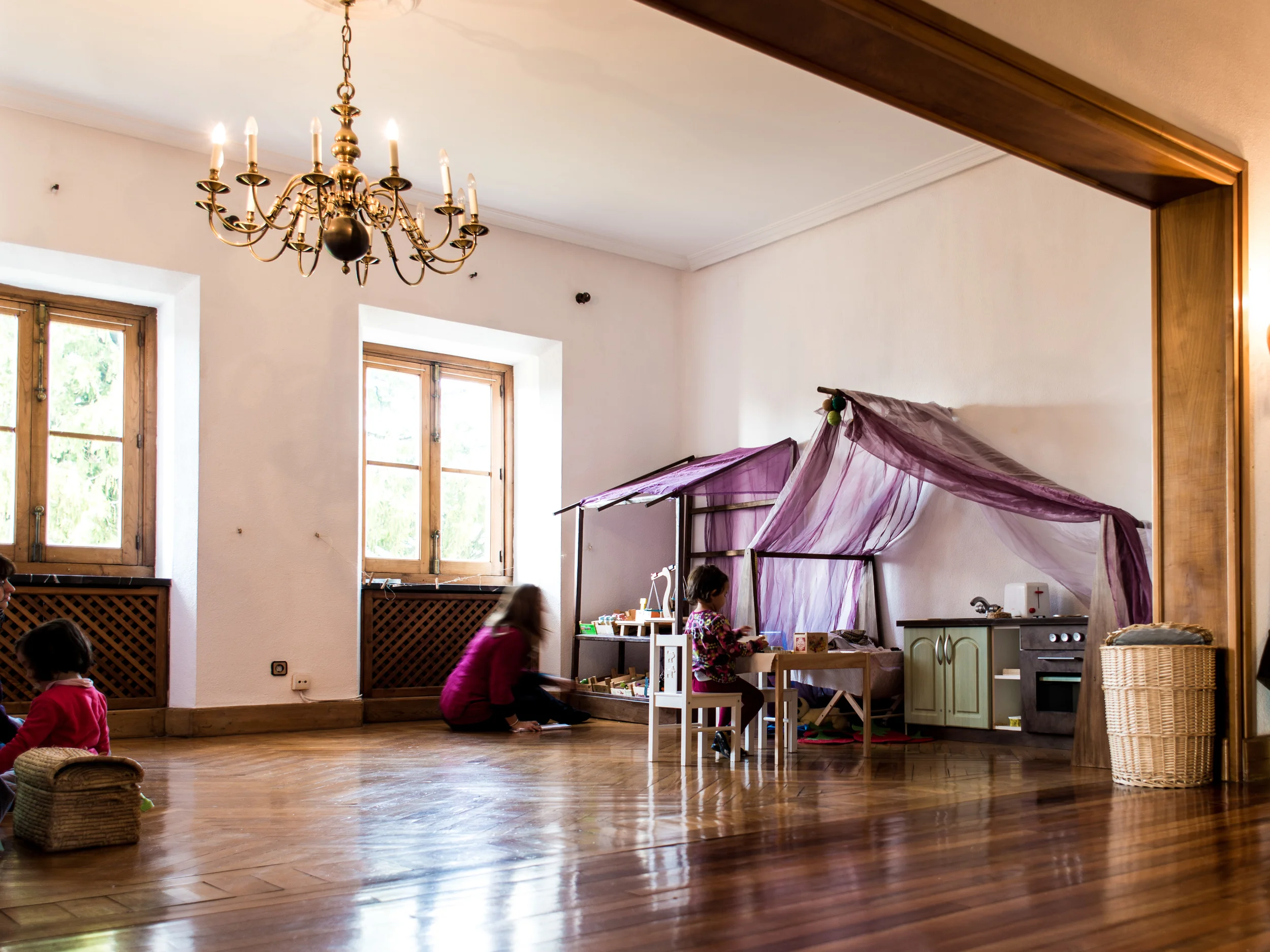 Cada mañana empieza con una pequeña asamblea de buenos días que sirve para organizar la jornada, y en la que cada niña y niño tiene la oportunidad de expresar sus sentimientos e ideas. A partir de ahí, los niños pueden ocupar su tiempo como ellos decidan: jugando libremente, o participando en las actividades que se ofrecen: lectura de un cuento, psicomotricidad basada en el método Aucouturier (para lo que disponen de un enorme establo reconvertido y acondicionado con colchonetas y otros materiales), pintura, teatro, música (impartida por dos músicos de la Orquesta del Principado de Asturias que son padre y madre de un alumno)... El día de nuestra visita, por ejemplo, tuvimos la oportunidad de participar en un taller de repostería: ¡íbamos a hacer galletas! Ni que decir tiene que Jara, nuestra hija de dos años, se unió entusiasmada y participó como una más en la preparación de los ingredientes, y sobre todo catando el resultado cuando salió del horno.