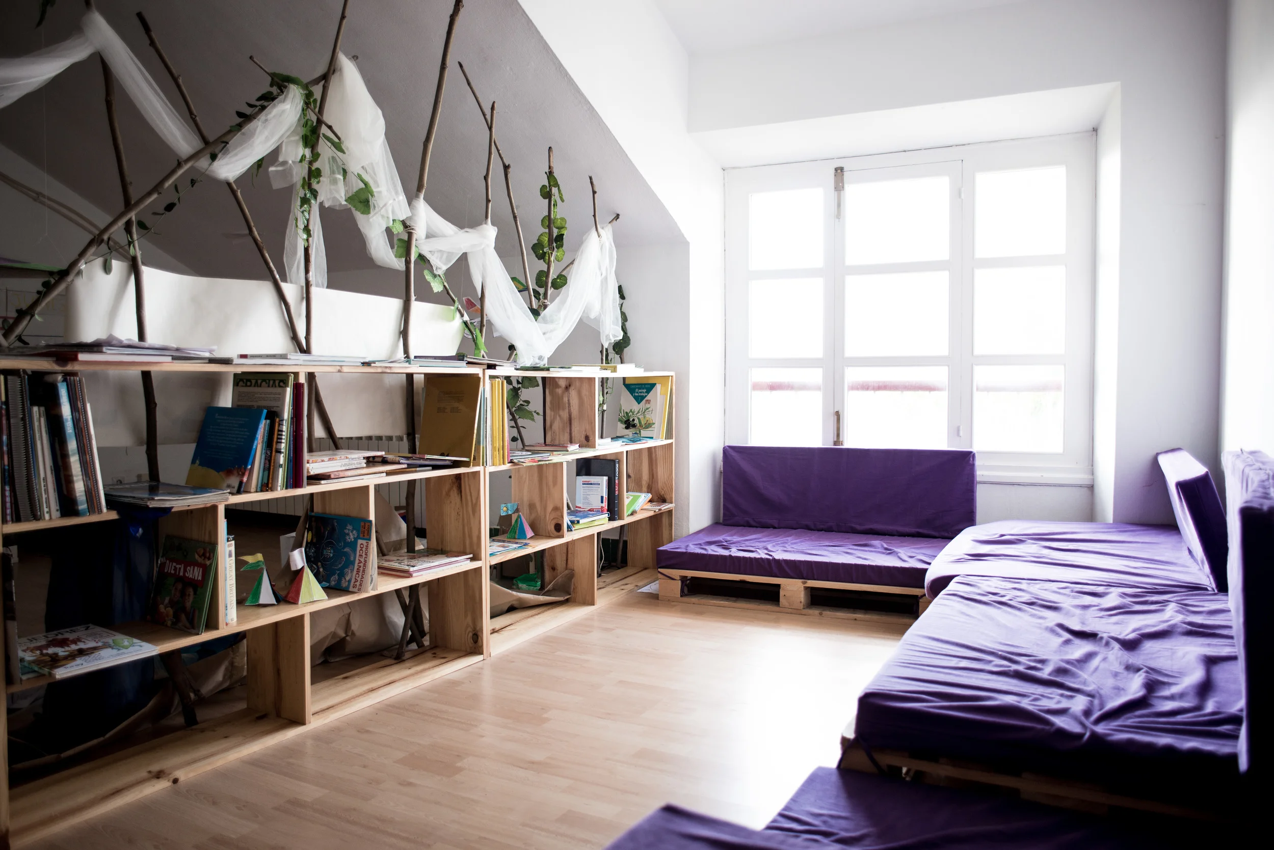 Nos recibe un pequeño grupo de madres y padres, y enseguida salen a nuestro encuentro las alumnas y alumnos, que nos proponen enseñarnos la escuela. Pero antes de nada, nos dicen, "¡hay que descalzarse para no ensuciar!". Con ellos recorremos la planta baja, donde está Infantil: 26 niños que comparten el espacio, los materiales y las actividades sin estar separados por edades. Todo el interior es amplísimo, los ventanales inmensos, y la luz baña las paredes y el suelo de madera creando un ambiente casi mágico. Dos acompañantes, Desi (que es además directora y nos ha alojado estos días en su casa) y Laura, han cuidado estos detalles tan importantes, pero de lo que más cuidan es de las emociones y necesidades de los peques. Los espacios están adaptados en función de su uso: hay una sala dedicada al juego simbólico, una para lectura (que es también un laboratorio donde trastear con materiales estructurados, algunos fabricados de reciclaje por las familias), una sala para música y expresión corporal... y en el baño, otra simpática sorpresa: las cañerías que llegan hasta las cisternas de los dos wáters infantiles se han moldeado para que formen las alas de una mariposa, pintada sobre la pared. En la planta de arriba están los espacios de primaria, que en el curso 2013-14 estaba integrada por 6 niños de hasta 8 años de edad.